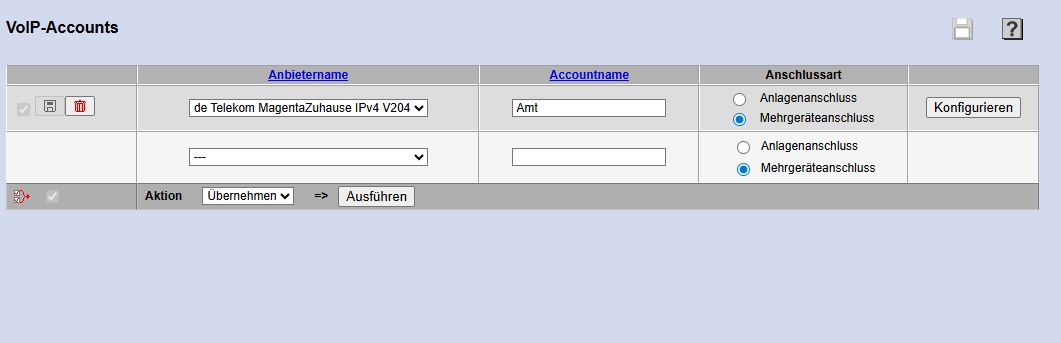 Ich bitte Dich Diesen so zu benennen wie ich es Dir vorschlage. Der Anbietername ist natürlich der Telekom-Zugang. Nenne den Account bitte einfach „Amt“. Es ist ein Mehrgeräteanschluß und nach dem Übernehmen bitte Konfigurieren.