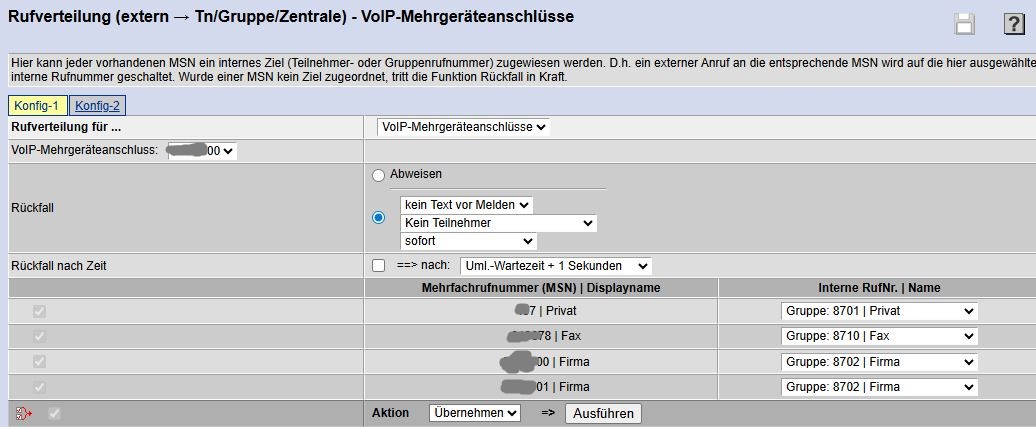 Die Variante „Amt“ klappt nicht, wenn ich bei Benutzernamen +49xxxxx00 (Firma) eintrage bekomme ich jetzt ein Besetztzeichen wenn ich diese Nr. anrufe, raus geht (in der FB habe ich jetzt alle Nummern deaktiviert) und bei alle anderen Nummern gehen wegen nicht Erreichbarkeit auf die Telekom Mailbox.