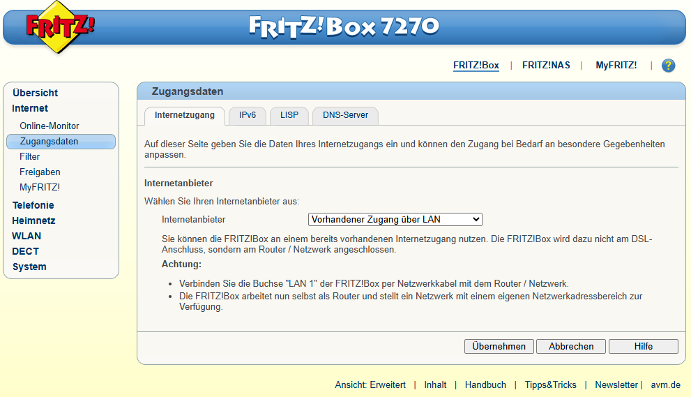 Ich habe jetzt eine 7390 dafür benutzt, dort konnte man den LAN1 als WAN umstellen. Jetzt habe nur noch zwei Probleme.