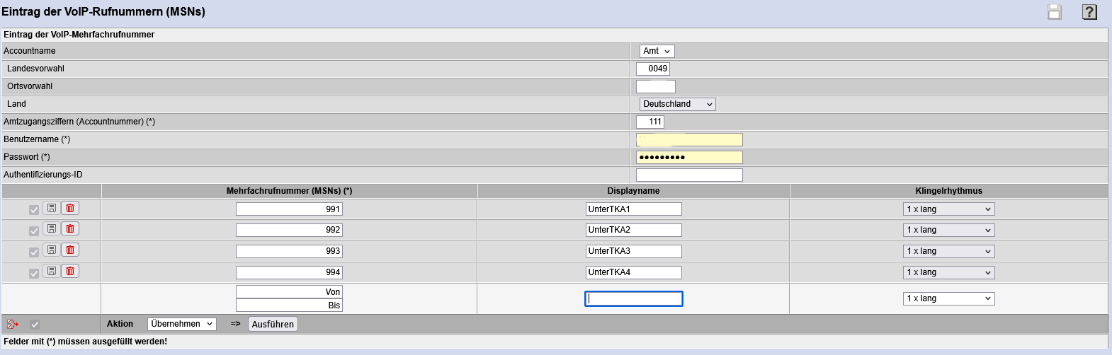 So wie Du sie anmelden sollst, so trägst Du auch Deine Registrierung dort ein (aber nur für eine Nummer). Im Router ist das Anders, weil er jede einzelne Rufnummer registriert. So wie Du es von T-Kom bekommen hast. Du listest dann natürlich alle MSN’s auf. Die Daten legetemieren lediglich den Zugriff, haben nichts mit der tatsächlichen Funktion zu tun.