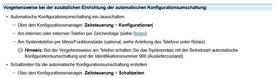 Außerdem läßt sich dies nicht nur intern via Rufnummer sondern auch auf die Funktionstaste eines SysTel’s legen und von außen über Telefon einstellen. Ebenso läßt sich die automatische Schaltfunktion ein- und ausschalten. Es ist damit also alles das möglich was Du erwartest.