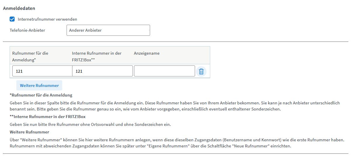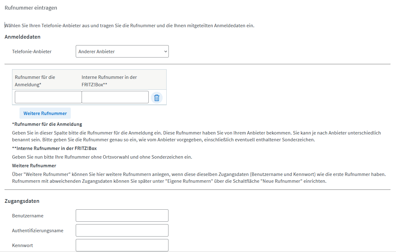 Hier wählst Du als erstes „anderer Anbieter“ aus. Danch trägst Du die NSt.-Nummer und die interne Nummer in der Fritzbox (sollten gleich sein) ein. Darauf folgen die Zugangsdaten: